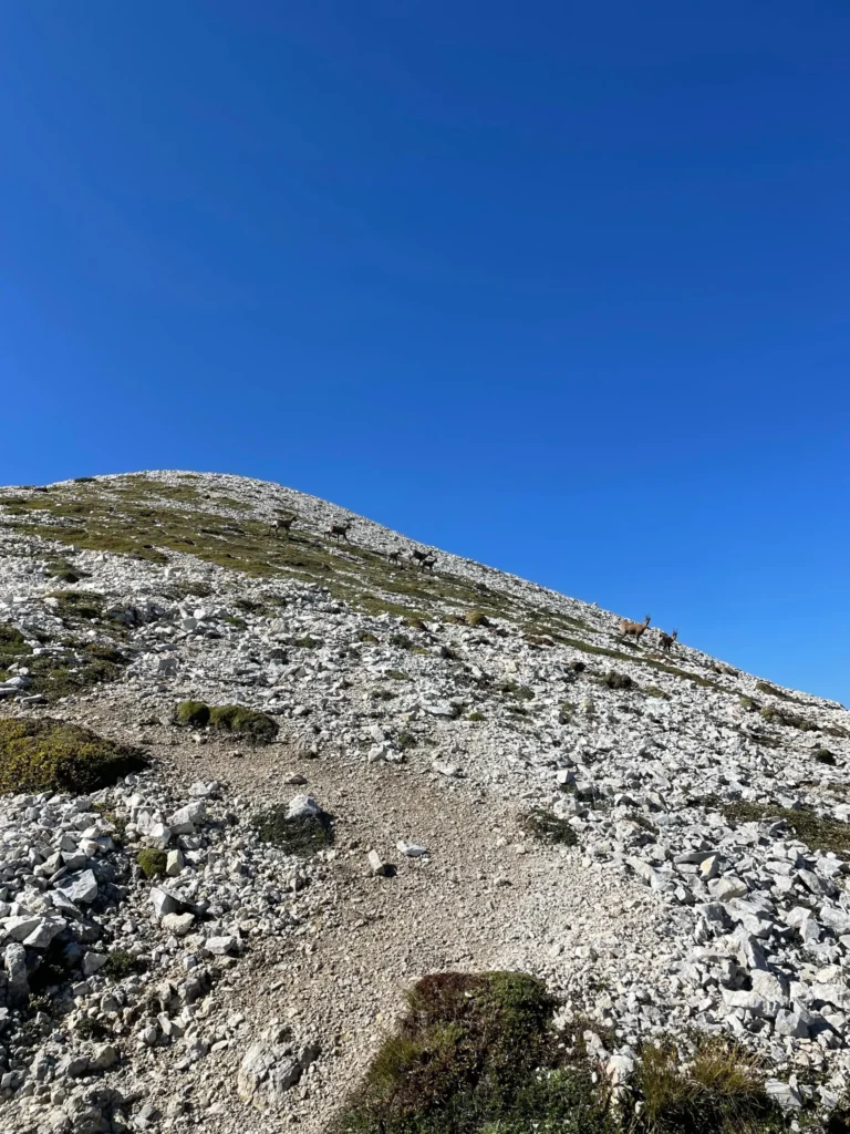 Man mano che si sale, il paesaggio diventa sempre più roccioso e severo, come è tipico delle quote superiori del massiccio. Il sentiero mantiene però una pendenza regolare e permette di avanzare con costanza. Qui la montagna si mostra in tutta la sua essenza: nuda, imponente, modellata dal vento e dal tempo.